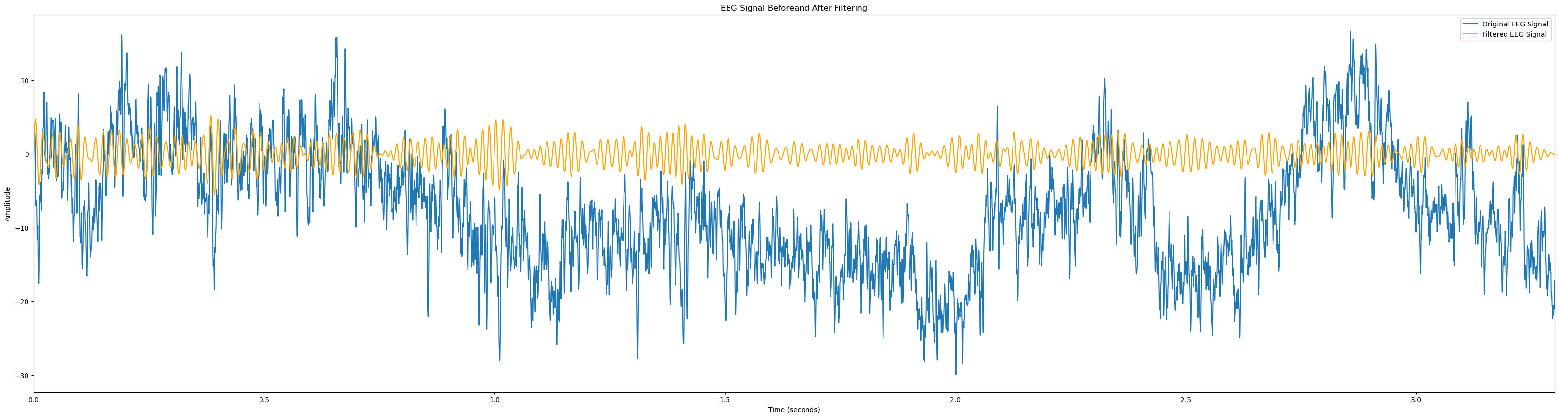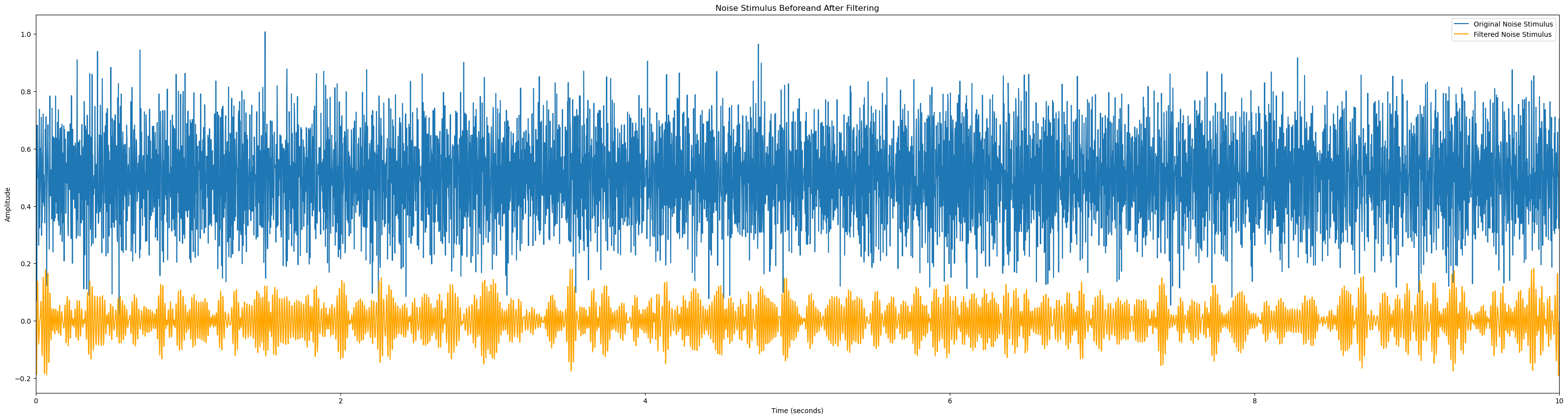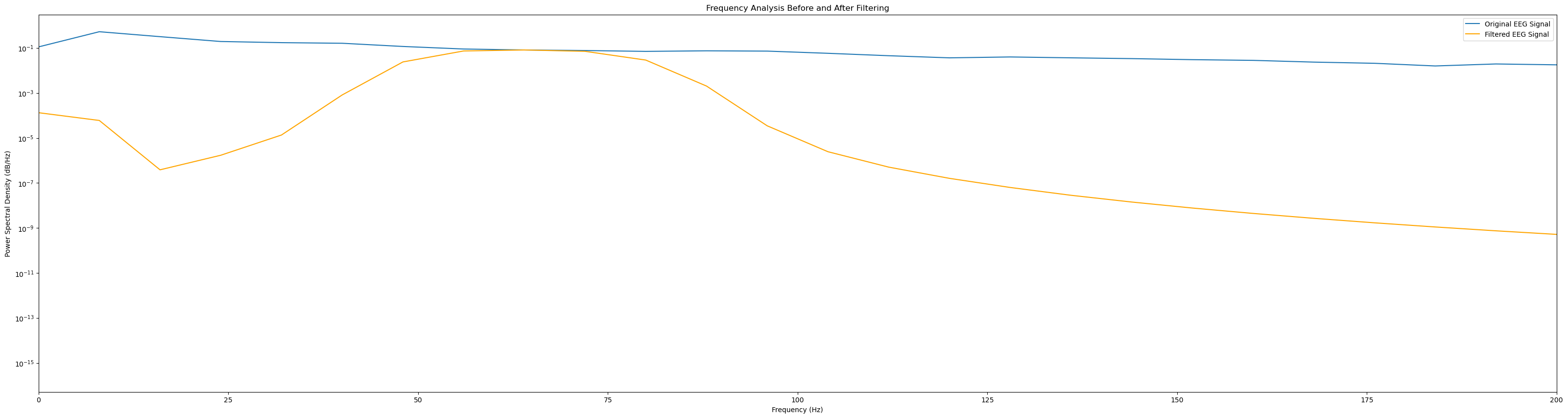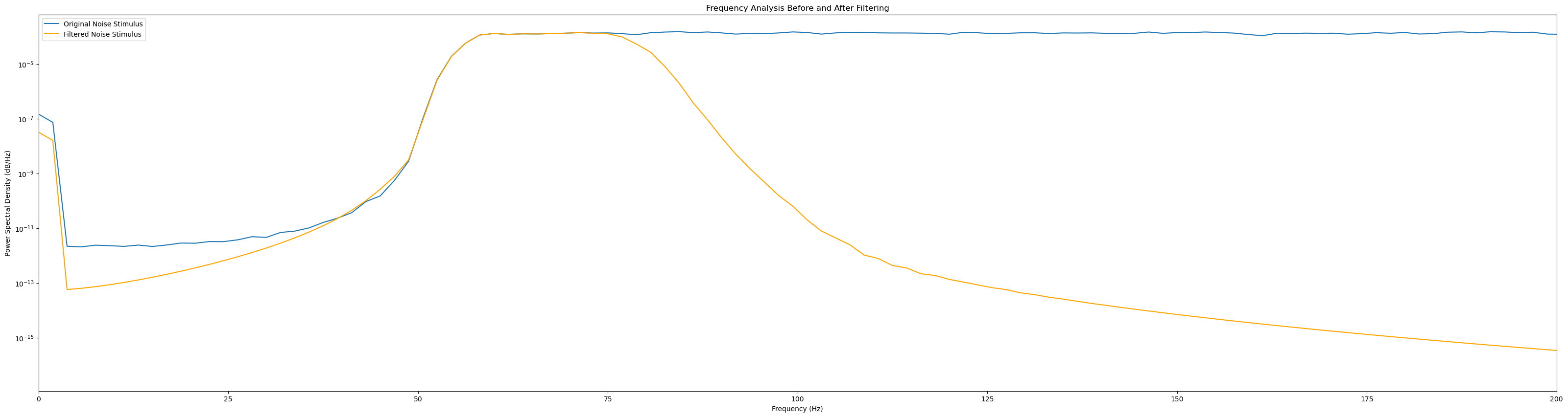 # Function to plot EEG channel before and after filteringdef plot_signal_filtering(signal, sampling_rate, lowcut, highcut, order=5, signal_name='EEG Signal'):# Apply bandpass filter filtered_signal = bandpass_filter(signal, lowcut, highcut, sampling_rate, order=order)# Time vector for plotting time_vector = np.linspace(0, len(signal) / sampling_rate, len(signal))# Plot EEG signal before and after filtering plt.figure(figsize=(40, 10)) plt.plot(time_vector, signal, label=f'Original {signal_name}') plt.plot(time_vector, filtered_signal, label=f'Filtered {signal_name}', color='orange') plt.title(f'{signal_name} Beforeand After Filtering') plt.xlabel('Time (seconds)') plt.ylabel('Amplitude') plt.xlim(0, len(signal) / sampling_rate) plt.legend() plt.show()# Frequency analysis before and after filtering freqs_before, psd_before = welch(signal, fs=sampling_rate) freqs_after, psd_after = welch(filtered_signal, fs=sampling_rate) plt.figure(figsize=(40, 10)) plt.semilogy(freqs_before, psd_before, label=f'Original {signal_name}') plt.semilogy(freqs_after, psd_after, label=f'Filtered {signal_name}', color='orange') plt.title('Frequency Analysis Before and After Filtering') plt.xlabel('Frequency (Hz)') plt.ylabel('Power Spectral Density (dB/Hz)') plt.xlim(0, 200) plt.legend() plt.show()# Example usage with the provided loopskip =2for _, experiment in experiment_data.iterrows():ifnot experiment['has_noise']: continueif skip >0: skip -=1continue channel =1 eeg_data = experiment['eeg'][:, channel] noise_stim_left = experiment['noise_stim_left']print(eeg_data.shape) plot_signal_filtering(eeg_data, sampling_rate=2048, lowcut=50, highcut=80) plot_signal_filtering(noise_stim_left, sampling_rate=480, lowcut=50, highcut=80, signal_name='Noise Stimulus')break