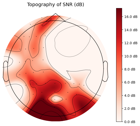 import mnedef calculate_snr(cross_corrs_all_trials, sampling_rate, expected_peak_time=None): snrs = []for channel_corrs in cross_corrs_all_trials: cumulative_corr = np.sum(channel_corrs, axis=0)# Time vector for the cross-correlation# time_vector = np.linspace(0, len(cumulative_corr) / sampling_rate, len(cumulative_corr))if expected_peak_time isnotNone:# Find the peak closest to the expected peak time peak_signal = np.max(cumulative_corr[int((expected_peak_time -0.0)*sampling_rate):int((expected_peak_time +0.1)*sampling_rate)])else:# Find the highest peak in the cross-correlationprint(np.max(cumulative_corr)) peak_signal = np.max(cumulative_corr)# Calculate the noise as the standard deviation of the cross-correlation noise = np.std(cumulative_corr) # Assuming this represents the noise snr =10* np.log10(peak_signal**2/ noise**2) snrs.append(snr)return snrs# Plot topographydef plot_topography(snr_values, channel_labels, sampling_rate): info = mne.create_info(ch_names=channel_labels, sfreq=sampling_rate, ch_types='eeg')# Use a standard montage for electrode positions montage = mne.channels.make_standard_montage('standard_1020') info.set_montage(montage)# Create Evoked object with SNR values evoked_data = np.array(snr_values).reshape(-1, 1) evoked = mne.EvokedArray(evoked_data, info)# Plot topography fig, ax = plt.subplots(figsize=(8, 6)) im, cn = mne.viz.plot_topomap(evoked.data[:, 0], evoked.info, axes=ax, show=False) fig.colorbar(im, ax=ax, format="%0.1f dB") ax.set_title('Topography of SNR (dB)', fontsize=14) plt.show()# Example usageexpected_peak_time =1.077# Adjust based on where you expect the peaksnr_values = calculate_snr(cross_corrs_all_trials, sampling_rate, expected_peak_time)plot_topography(snr_values, channel_labels, sampling_rate)