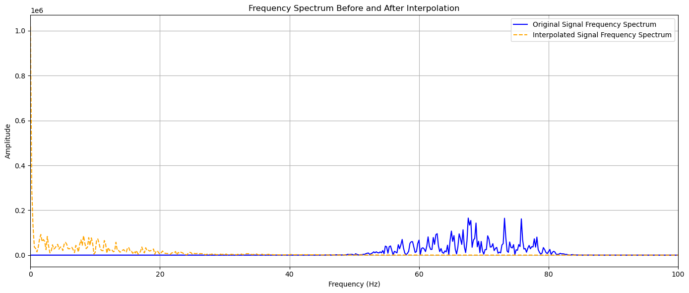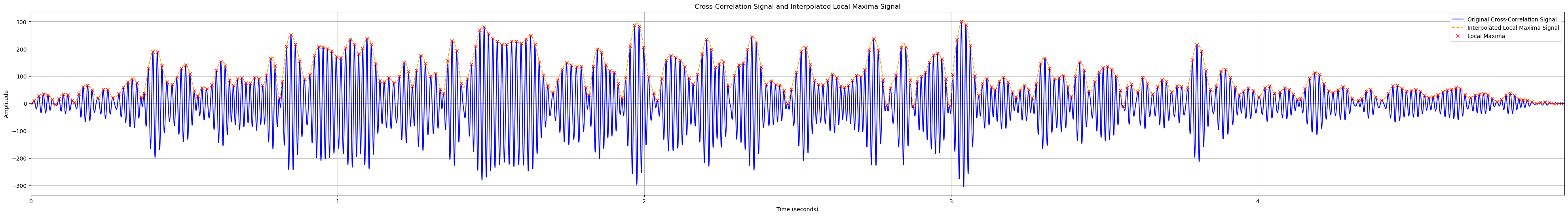 def interpolate_local_maxima(signal, sampling_rate):# Find peaks (local maxima) peaks, _ = find_peaks(signal)# Extract peak values and their corresponding times peak_values = signal[peaks] peak_times = peaks / sampling_rate# Create an interpolation function interp_func = interp1d(peak_times, peak_values, kind='cubic', fill_value="extrapolate")# Interpolate over the entire signal duration full_time_vector = np.arange(len(signal)) / sampling_rate interpolated_signal = interp_func(full_time_vector)return interpolated_signal, peakssampling_rate =2048noise_experiments = experiment_data[experiment_data['has_noise']]for _, experiment in noise_experiments.iterrows(): eeg_data = experiment['eeg'] noise_stim_left = experiment['noise_stim_left'] noise_stim_right = experiment['noise_stim_right'] lags, cross_corrs = compute_best_combined_offset(eeg_data, noise_stim_left, noise_stim_right, channel_labels, upsample_noise=True, eeg_start_time=0.0, eeg_end_time=3.2, noise_start_time=0.1, noise_end_time=1.9, bandpass_eeg=(50, 80), bandpass_noise=(50, 80),# mix_noise_strength=0.1, plot_results=False)# Plot the cross-correlation for the first channel channel =26 cross_corr = cross_corrs[channel] interpolated_signal, peaks = interpolate_local_maxima(cross_corr, sampling_rate=sampling_rate)# Plot the original cross-correlation signal and the interpolated local maxima signal plt.figure(figsize=(50, 6))# Time vector for cross-correlation signal corr_time_vector = np.linspace(0, len(cross_corr) / (sampling_rate), len(cross_corr))# Plot original cross-correlation signal plt.plot(corr_time_vector, cross_corr, label='Original Cross-Correlation Signal', color='blue')# Plot interpolated local maxima signal plt.plot(corr_time_vector, interpolated_signal, label='Interpolated Local Maxima Signal', color='orange', linestyle='--')# Mark peaks plt.plot(corr_time_vector[peaks], cross_corr[peaks], 'x', label='Local Maxima', color='red')# Add titles and labels plt.title('Cross-Correlation Signal and Interpolated Local Maxima Signal') plt.xlabel('Time (seconds)') plt.ylabel('Amplitude') plt.legend() plt.xlim(0, len(cross_corr) / sampling_rate) plt.grid(True)# Show plot plt.show()# Compute the FFT of the original cross-correlation signal and the interpolated local maxima signal freqs = np.fft.fftfreq(len(cross_corr), 1/ sampling_rate) fft_original = np.abs(np.fft.fft(cross_corr)) fft_interpolated = np.abs(np.fft.fft(interpolated_signal))# Plot the frequency spectrum before and after interpolation plt.figure(figsize=(14, 6))# Plot original signal frequency spectrum plt.plot(freqs[:len(freqs)//2], fft_original[:len(freqs)//2], label='Original Signal Frequency Spectrum', color='blue')# Plot interpolated signal frequency spectrum plt.plot(freqs[:len(freqs)//2], fft_interpolated[:len(freqs)//2], label='Interpolated Signal Frequency Spectrum', color='orange', linestyle='--')# Add titles and labels plt.title('Frequency Spectrum Before and After Interpolation') plt.xlabel('Frequency (Hz)') plt.ylabel('Amplitude') plt.legend() plt.xlim(0, 100) plt.grid(True) plt.tight_layout()# Show plot plt.show()break