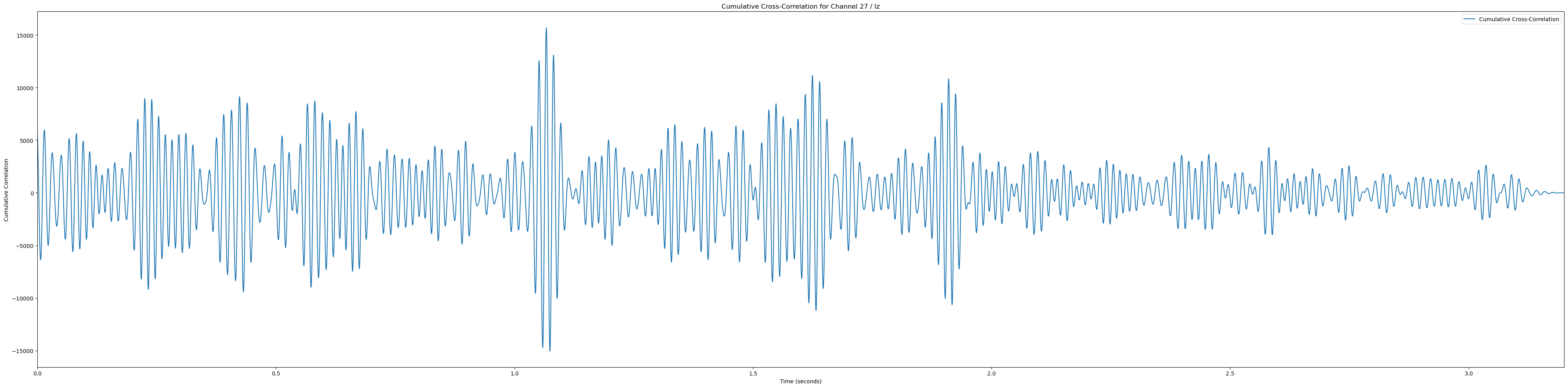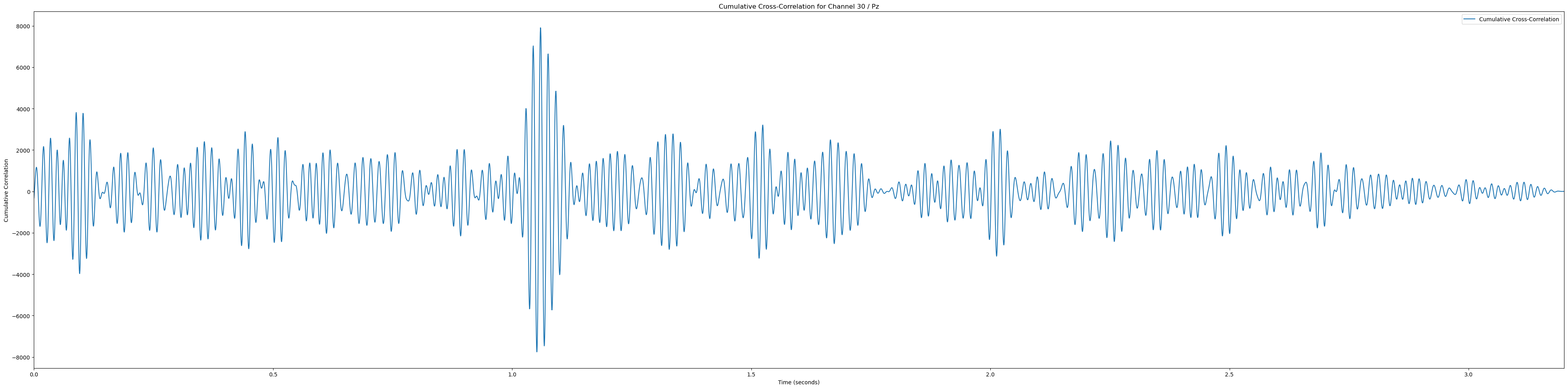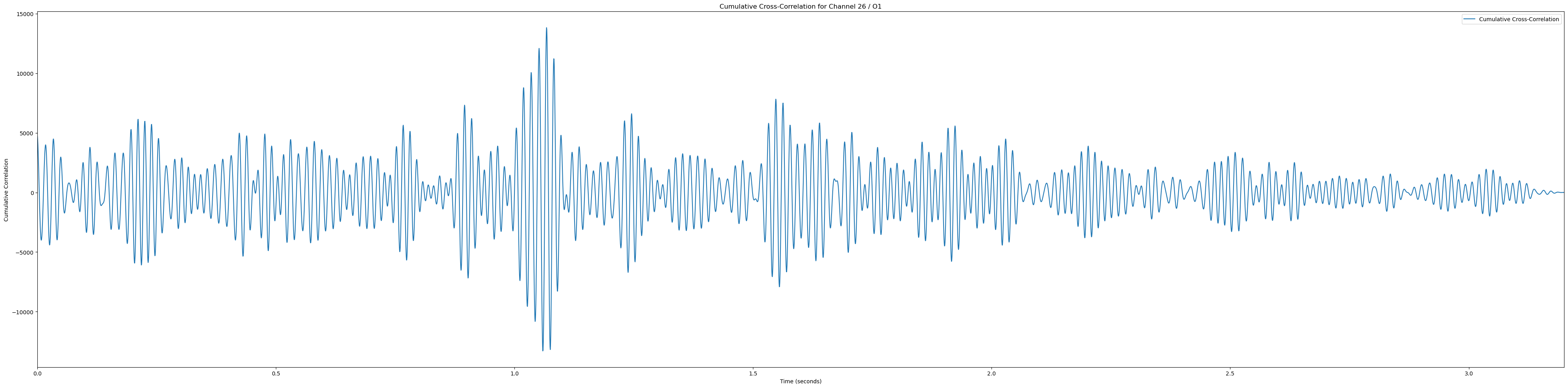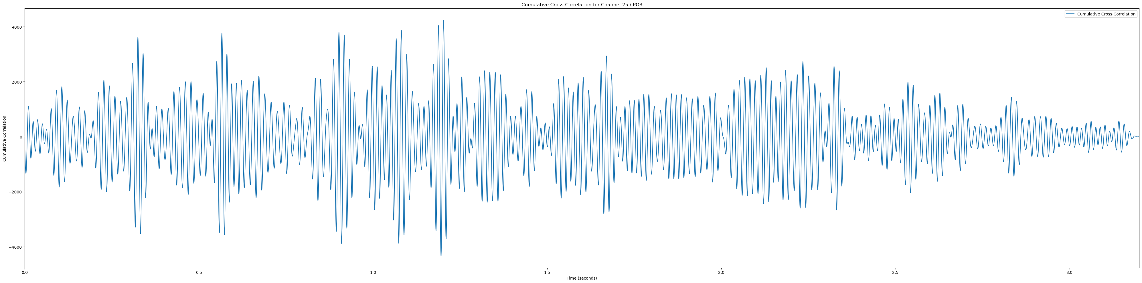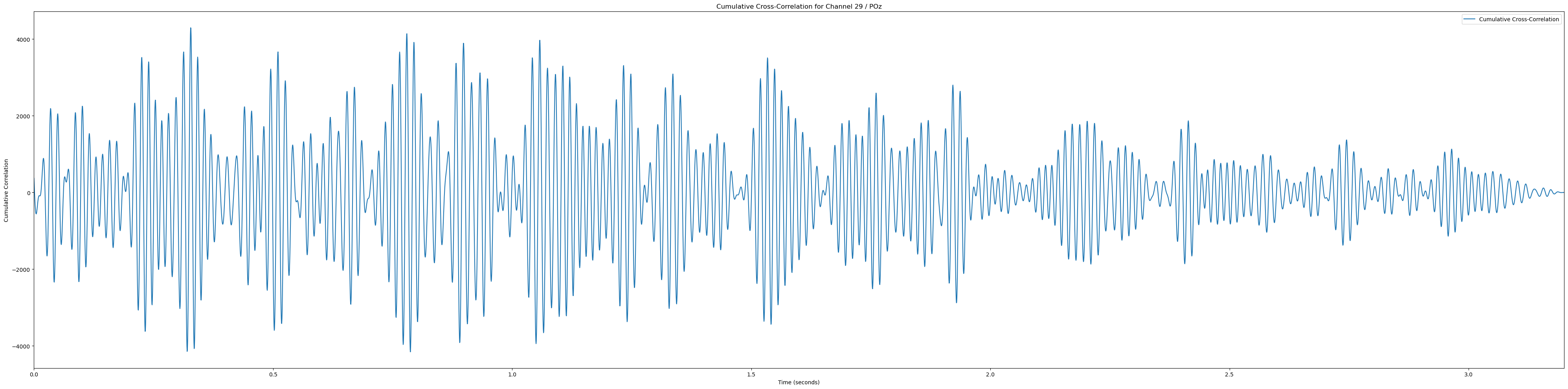 num_channels = eeg_data.shape[1]noise_experiments = experiment_data[experiment_data['has_noise']]print(noise_experiments.shape)cross_corrs_all_trials = [[] for _ inrange(num_channels)]def process_experiment(experiment, channel_labels): eeg_data = experiment['eeg'] noise_stim_left = experiment['noise_stim_left'] noise_stim_right = experiment['noise_stim_right'] lags, correlations = compute_best_combined_offset(eeg_data, noise_stim_left, noise_stim_right, channel_labels, upsample_noise=True, eeg_start_time=0.0, eeg_end_time=3.2, noise_start_time=0.0, noise_end_time=2.0, # noise times present in the experiment# noise_start_time=4.0, noise_end_time=6.0, # noise times not present in the experiment bandpass_eeg=(50, 80), bandpass_noise=(50, 80),# mix_noise_strength=0.2, plot_results=False)# correlations = [interpolate_local_maxima(corr, 2048)[0] for corr in correlations]return correlationsdef parallel_process_experiments(experiments, channel_labels, num_channels): cross_corrs_all_trials = [[] for _ inrange(num_channels)]with ProcessPoolExecutor() as executor: futures = {executor.submit(process_experiment, experiment, channel_labels): i for i, experiment in experiments.iterrows()}for future in as_completed(futures): correlations = future.result()for channel inrange(num_channels): cross_corrs_all_trials[channel].append(correlations[channel])return cross_corrs_all_trialscross_corrs_all_trials = parallel_process_experiments(noise_experiments, channel_labels, num_channels)# Plot heatmaps for each channelsampling_rate =2048for channel, channel_label inenumerate(channel_labels):if channel_label notin ['Pz', 'POz', 'Iz', 'O1', 'PO3']: continue# Only plot the interesting occipital channels plt.figure(figsize=(40, 10))# Plot heatmap of cross-correlations for all trials# plt.subplot(2, 1, 1)# sns.heatmap(np.array(cross_corrs_all_trials[channel]), cmap='viridis', cbar=False)# plt.title(f'Heatmap of Cross-Correlations for Channel {channel + 1} / {channel_labels[channel]}')# plt.xlabel('Lag')# plt.ylabel('Trial')# plt.subplot(2, 1, 2)# Calculate and plot cumulative cross-correlation cumulative_corr = np.sum(np.array(cross_corrs_all_trials[channel]), axis=0) time_vector = np.linspace(0, len(cumulative_corr) / sampling_rate, len(cumulative_corr)) plt.plot(time_vector, cumulative_corr, label='Cumulative Cross-Correlation') plt.title(f'Cumulative Cross-Correlation for Channel {channel +1} / {channel_labels[channel]}') plt.xlabel('Time (seconds)') plt.ylabel('Cumulative Correlation') plt.xlim(0, time_vector[-1]) plt.legend() plt.tight_layout() plt.show()