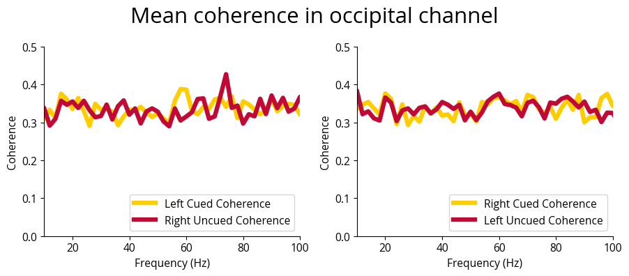 fig.suptitle(f'Mean coherence in occipital channel', fontsize=font_size)